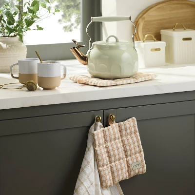 Give your guests a memorable tea party experience using this Arch Cutout Teapot from Hearth & Hand™ with Magnolia. Made of metal, this teapot features arch cutouts for an elegant look. This two-quart teapot also features a spout with an opening mechanism, a removable lid, and a whistle to let you know when the water is ready. Designed in a serene green hue, it’s compatible with electric coil, gas and induction stoves for versatile use.