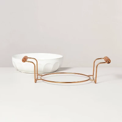 Bring your baked dishes directly from the oven to the table with the 3-Quart Oven-to-Table Fluted Stoneware Round Baking Dish with Cradle Carrier from Hearth & Hand™ with Magnolia. This round baking dish features a fluted exterior and comes with a gold-tone cradle carrier with side handles for easy carrying. The even-heating feature helps cook perfectly baked dishes. Made with stoneware, this fluted baking dish is oven-safe up to 500 degrees, and dishwasher safe for easy cleanup. Plus, you can use it to reheat food in the microwave or store in the freezer.