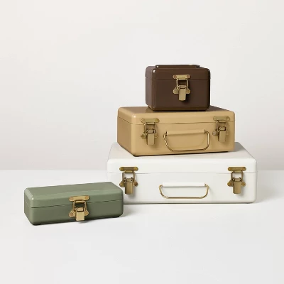 Add stylish storage to your home with this Large Metal Box with Brass Hardware from Hearth & Hand™ with Magnolia. Made of metal, this rectangular box is ideal for storing a variety of everyday use items. This lidded box is designed in a sour cream hue and is accentuated with a center handle and two brass-finished latch closures for a simple yet elegant look.