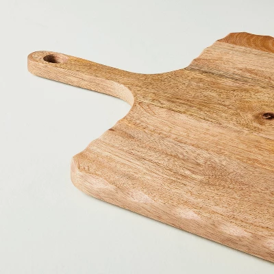Present your food in style with this Square Wood Board from Hearth & Hand™ with Magnolia. Made of wood, this rectangular board features carved edges in a scalloped design that ensure safe use and give a distinct look to your table. Additionally, it features a handle for easy portability and includes a hole for hanging from a peg, allowing for efficient storage.
