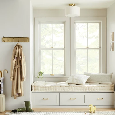 Beautifully illuminate any space in your home with this Semi-Flush Mount Ceiling Fabric Shade from Hearth & Hand™ with Magnolia. This decorative fixed lighting features a fabric drum shade attached to a iron body in a solid brass finish to bring a dash of modern style. This semi-flush mount ceiling light looks great in your living room or hang it above the kitchen island for a functional and stylish lighting solution that will complement a wide variety of color palettes.