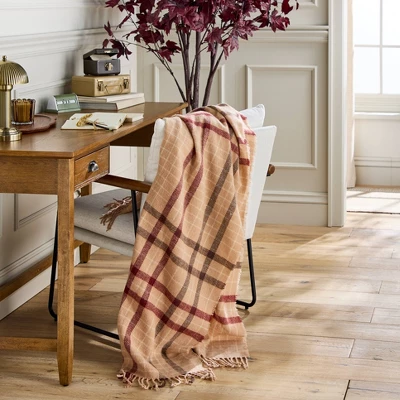 Fill your living space with autumnal charm with this Fall Plaid Lightweight Throw Blanket from Hearth & Hand™ with Magnolia. Made from 100% recycled polyester fabric and featuring a woven construction, this decorative throw blanket feels soft and cozy, making it perfect for snuggling up or styling your favorite chair or couch. Featuring a plaid design in rust and gray hues on a brown background accented with matching fringed trimming, it’s sure to bring seasonal charm to your space.