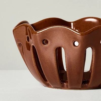 Enjoy berries and other small snacks and apps with family and friends using the Set of 4 Wavy Edge Mini Berry Bowls from Hearth & Hand™ with Magnolia. This set of four miniature berry bowls includes tan, brown, green and winter tan colors, all designed with wavy edges for an artisanal look. Made of stoneware and glazed with a glossy finish, the bowls have holes and cutouts to help drain excess water.