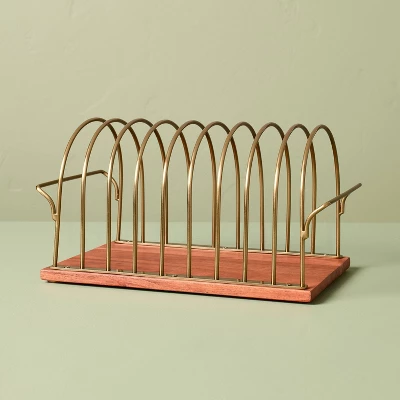 Display your vinyl collection in a style with the Vinyl Storage Solution from Hearth & Hand™ with Magnolia. This vinyl storage is designed in a rectangular shape with multiple bars to help provide enough space for your vinyl. Designed with a wooden base, it features metal bars to help keep items separate and contained. Plus, the extended handles make it easy to move.